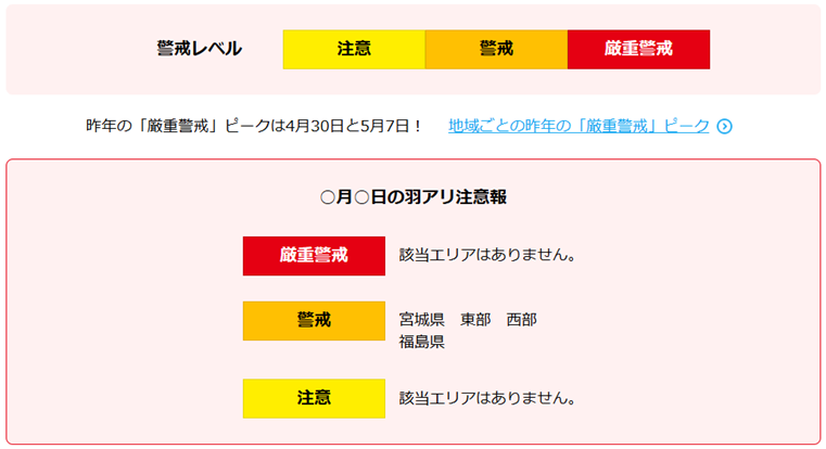 ■昨年の発生ピークを振り返る:昨年3,000件超のプロット地点や、地域別の警戒レベル発表実績(昨年は4月30日、5月7日がピーク)を網羅しています。